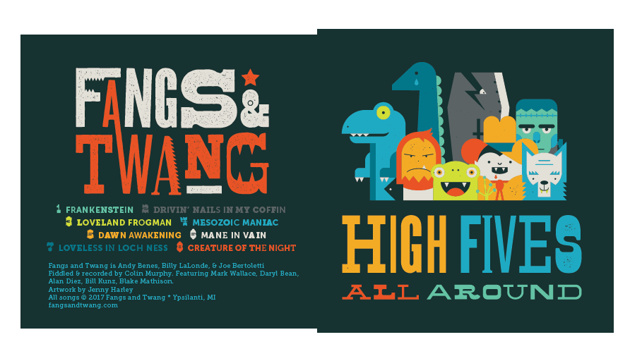 Fangs and Twang started recording their monstrous tales for “High Fives All Around” in January with Ypsilanti-based engineer and musician Colin Murphy and completed the final mixes about two weeks ago. The album also features Murphy on fiddle, Daryl Bean, Alan Diez and Bill Kunz on horns and Mark Wallace and Blake Mathison.